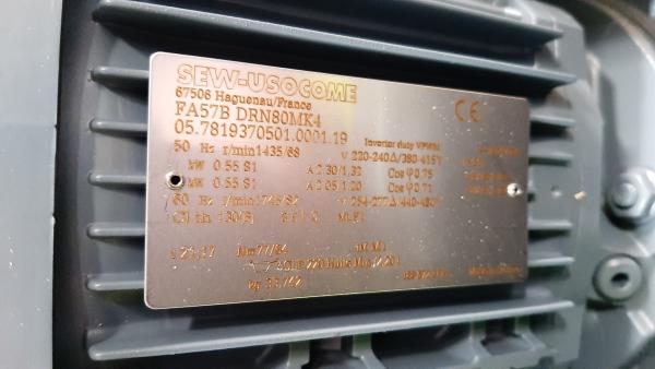 Gearmotors 0.55kw. Speed 50hz [rpm] 1435 / 68. Speed 60hz [rpm] 1745 / 82. Total reduction ratio [i] 21.17. Max torque [Nm] 600. Output torque 50hz [Nm] 77. Output torque 60hz [Nm] 64. Duty factor SEW FB 7.70 / 9.40. Mounting position IM M1.