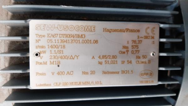 Speed 1400 / 18 total gear ratio 76.37 output torque 575 utilization factor SEW FB 1.45 mounting position IM M1B electrical specification IEC.