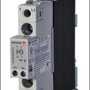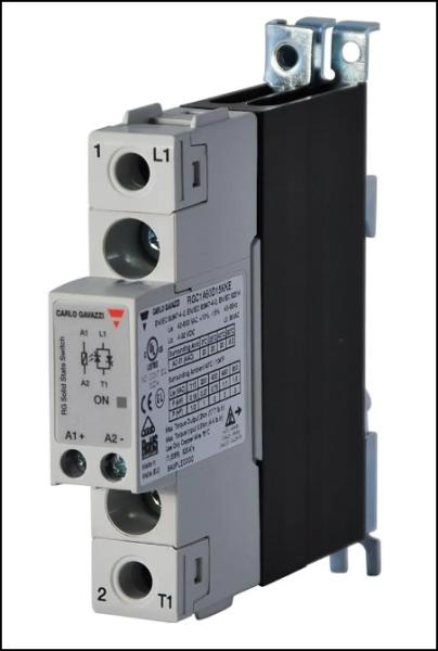 CARLO GAVAZZI RGC1A60D15KKE solid state relay. Rated load current: 20 A. Load voltage range: 42 VAC to 600 VAC. Control voltage range: 3 VDC to 32 VDC. Input current: 150 mA.