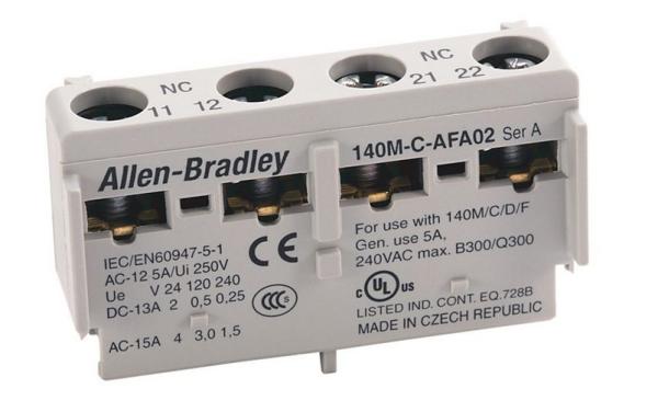 Bloque de contacto auxiliar para interruptor de potencia/controlador de motor serie 140M-C/D/F, 1NA+1NC, capacidad de interrupción 3/2 A 230/400 V AC (AC-15), acoplable frontalmente.
