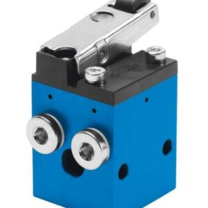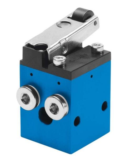 Función de distribuidor 4/2 monoestable, modo de accionamiento mecánico, caudal nominal normal 128 l/min, conexión de trabajo neumática G1/8, presión de servicio 0,35 MPa … 0,8 MPa.