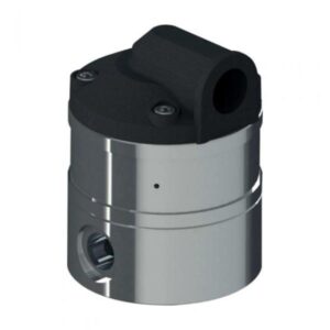 «Medidor de flujo de engranaje oval con un rango de medición de 0,5 a 36 l/h. El cuerpo y las ruedas son de acero inoxidable, la conexión de proceso es un G1/8, el sello es FKM, la electrónica tiene una salida de 4-20 mA y la prensaestopas es un M20.»