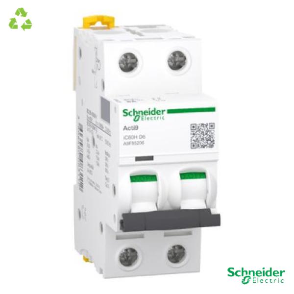 Disjoncteur Acti9 iC60H, 2 pôles, 6 A, courbe D, 10 000 A (IEC 60898-1), 15 kA (IEC 60947-2).