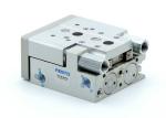 Mini-chariot avec guidage à billes précis et robuste et butées de fin de course réglables. Course=20 mm, Zone/longueur de fin de course ajustable=12 mm, Diamètre de piston=20 mm, Mode de fonctionnement unité d'entraînement=Etrier, Amortissement=P : Bagues/plaques d'amortissement élastiques des deux côtés