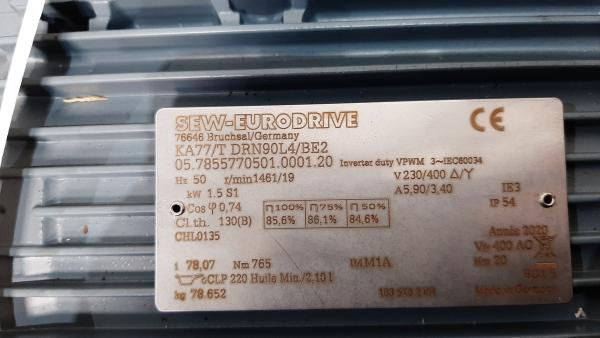 Vitesse 1461 / 19 tr/min. Rapport de réduction total 78,07. Couple maximal 1.550 Nm. Couple de sortie 765 Nm. Facteur d'utilisation SEW FB 2,00. Position de montage IM M1A.