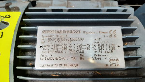 Vitesse tr/min 1410 / 60.0 Vitesse tr/min 1710 / 73.0 Rapport de réduc. total i 23,44 Couple de sortie Nm 240 / 196 Facteur d'utilisation SEW FB 2,40 / 2,90 Position de montage IM M1 Prescription électrique IEC.