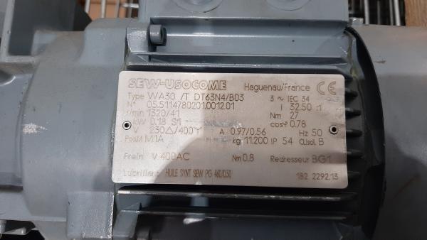 Moteur triphasé 0.18kw. Vitesse 1320 / 41 tr/min. Rapport total 32,50. Couple de sortie 27 nm. Facteur de service 2,60 / 0,00. Position de montage m1a. Régulation électrique iec.