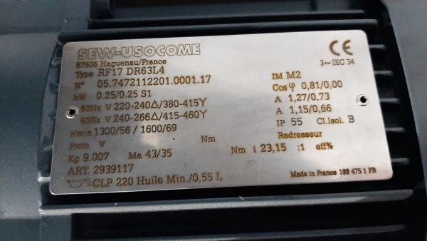 Vitesse 50Hz [tr/min] 1300 / 56 Vitesse 60Hz [tr/min] 1600 / 69 Rapport de réduc. total [i] 23,15 Couple max [Nm] 85 Couple de sortie 50Hz [Nm] 43 Couple de sortie 60Hz [Nm] 35 Facteur d'utilisation SEW FB 2,00 / 2,50 Position de montage IM M2 Dénomination ISO CLP 220 Type de lubrifiant Huile minérale Qté de lubrifiant [l] 0,55.