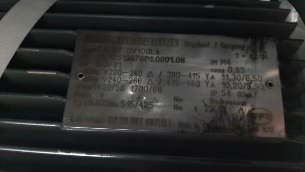 Vitesse 50hz [r/min] 1400 / 56. Vitesse 60hz [r/min] 1700 / 68. Rapport total [i] 25,13. Couple de sortie 50hz [Nm] 515. Couple de sortie 60hz [Nm] 425. Facteur de service SEW-FB 1,60 / 1,95. Position de montage M4. Régulation électrique IEC.