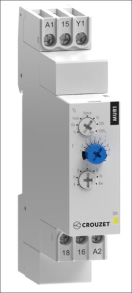 Temporisation de 0,1 seconde à 100 heures. Sortie : 1 relais inverseur. Intensité nominale 8A. Connexions par bornes à vis. Tension d'alimentation 24 V DC / 24 à 240 V AC.